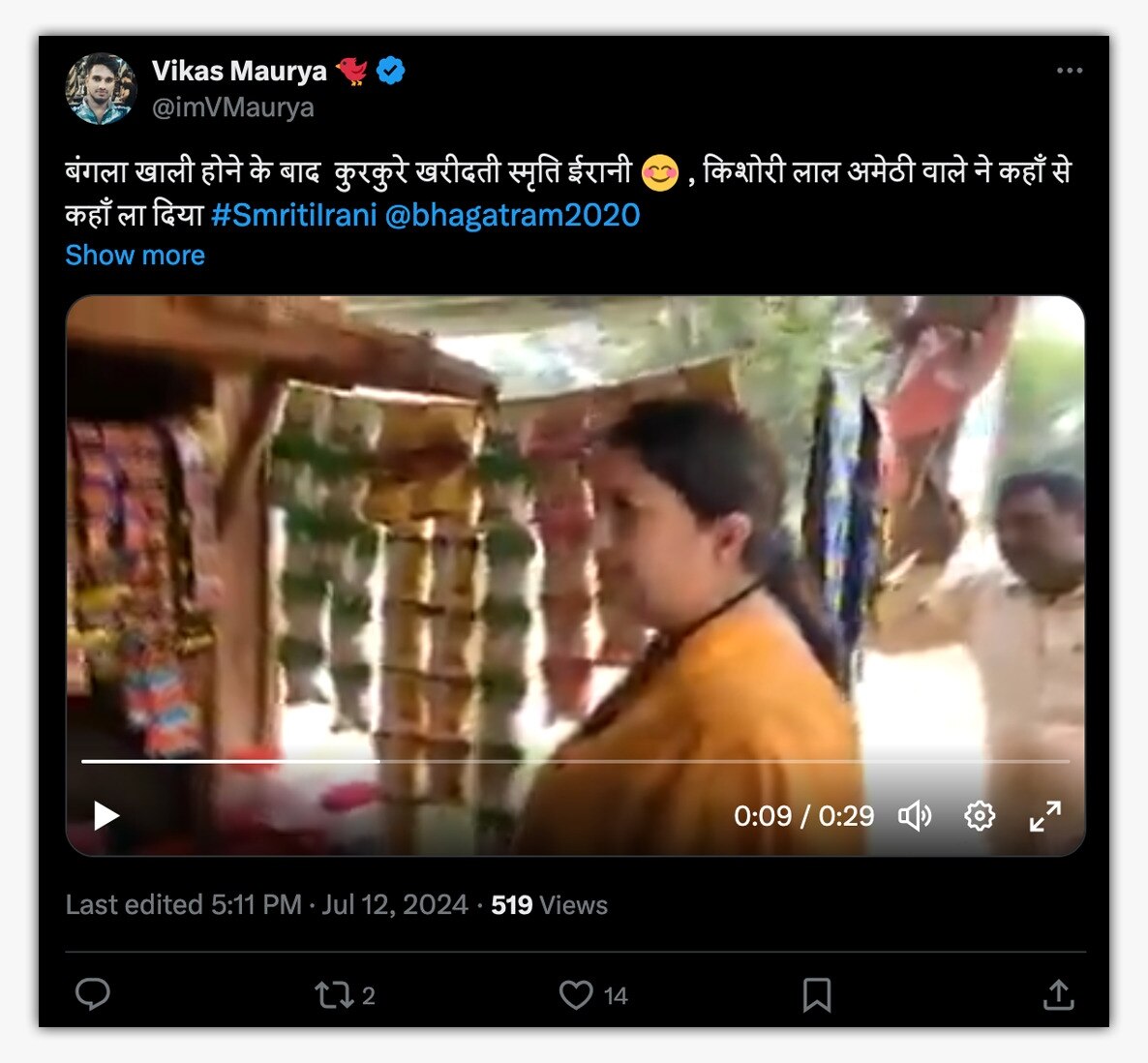 एक एक्स यूजर ने वायरल वीडियो को शेयर करते हुए लिखा, “बंगला खाली होने के बाद कुरकुरे खरीदती स्मृति ईरानी, किशोरी लाल अमेठी वाले ने कहाँ से कहाँ ला दिया.”