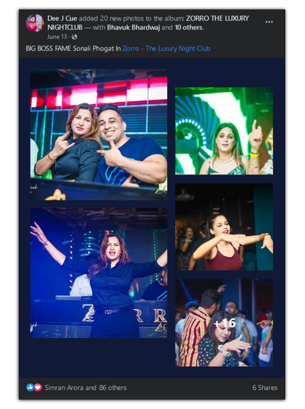 इस जानकारी की मदद से हमने ‘Zorro Club’ और ‘Sonali Phogat’ कीवर्ड्स को सर्च किया. ऐसा करने से हमें फेसबुक पर ‘जोरो- द लग्जरी नाइट क्लब’ के डीजे सुमित चौहान की एक फेसबुक पोस्ट मिली. इस पोस्ट में सोनाली फोगाट की दो तस्वीरें हैं. साथ ही, कैप्शन में लिखा है, ‘जोरो- द लग्जरी नाइट क्लब’ में ‘बिग बॉस’ फेम सोनाली फोगाट’. गौर करने की बात है कि सुमित चौहान उर्फ ‘Dee J Cue’ ने सोनाली फोगाट की ये तस्वीरें 13 जून की रात को 3 बजकर 27 मिनट पर पोस्ट की थीं. यानी जिस वक्त उन्होंने फोटो पोस्ट की उस समय लगभग सुबह होने वाली थी और यही वो समय है जब ज्यादातर नाइट क्लब बंद होने लगते हैं.