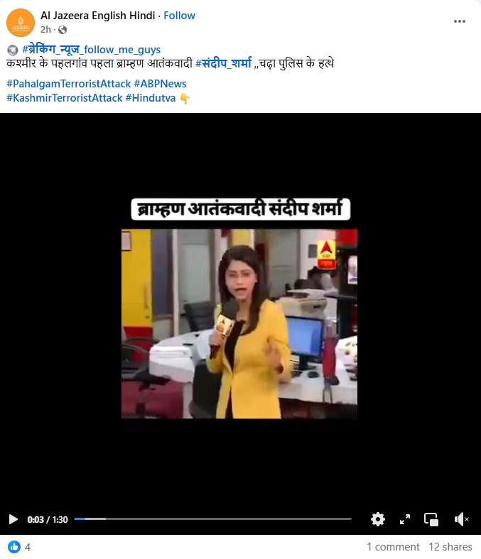 वीडियो के साथ कैप्शन में लिखा है, “ब्रेकिंग न्यूज कश्मीर के पहलगांव पहला ब्राम्हण आतंकवादी #संदीप_शर्मा, चढ़ा पुलिस के हत्थे #PahalgamTerroristAttack #ABPNews #KashmirTerroristAttack #Hindutva”. इस कैप्शन के साथ वीडियो को इंस्टाग्राम, एक्स और फेसबुक पर कई लोग शेयर कर चुके हैं.