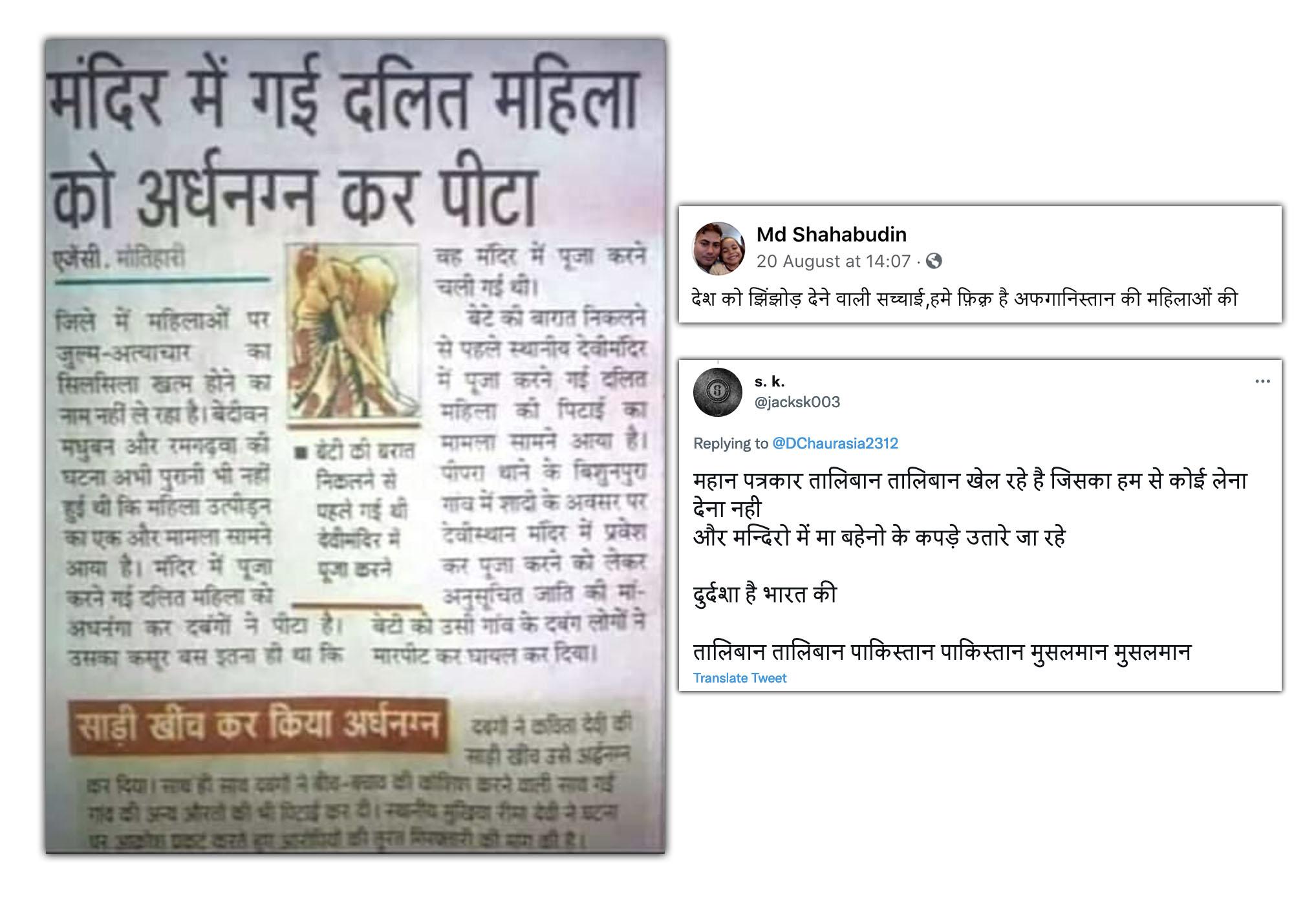 अफगानिस्तान पर तालिबान का कब्जा हो जाने के बाद से भारत सहित अंतरराष्ट्रीय मीडिया में ये मुद्दा छाया हुआ है. न्यूज़ चैनल्स पर ज्यादातर खबरें तालिबान को लेकर ही दिखाई जा रही हैं. इस बीच सोशल मीडिया पर अखबार की एक क्लिपिंग वायरल हो रही है जिसमें लिखा है कि बिहार के मोतिहारी में मंदिर गई एक दलित महिला को अर्धनग्न कर पीटा गया. इस खबर को पोस्ट करते हुए यूजर्स लिख रहे हैं कि देश के मंदिरों में महिलाओं को पीटा जा रहा है लेकिन भारतीय मीडिया अफगानिस्तान की महिलाओं की फिक्र करने में लगा है.