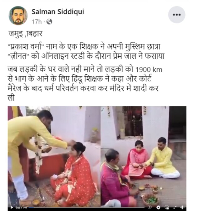 फेसबुक पर वीडियो शेयर करते हुए एक व्यक्ति ने लिखा, “लोकेशन: जमुई, बिहार #Bhagwalovetrap ‘प्रकाश वर्मा’ नाम के एक शिक्षक ने अपनी मुस्लिम छात्रा ‘ज़ीनत’ को ऑनलाइन स्टडी के दौरान प्रेम जाल में फसाया. जब लड़की के घर वाले नहीं माने तो लड़की को 1900 km से भाग के आने के लिए शिक्षक ने कहा और कोर्ट मैरेज के बाद धर्म परिवर्तन करवा कर मंदिर में शादी कर लिया.” ऐसे ही एक पोस्ट के आर्काइव्ड वर्जन को यहां देखा जा सकता है.