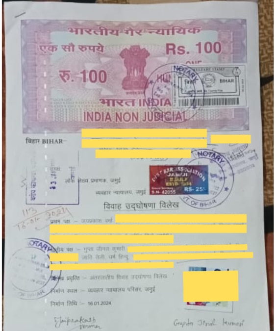 जयप्रकाश ने हमें अपने मैरिज सर्टिफिकेट की तस्वीर भी भेजी, जिसे नीचे देखा जा सकता है. उनके कहने पर हमने इस डाक्यूमेंट में लिखी कुछ निजी जानकारियों को छिपा दिया है. लेकिन, इसमें साफ देखा जा सकता है कि उनकी पत्नी, गुप्ता जीनल कुमारी, एक हिंदू महिला हैं.