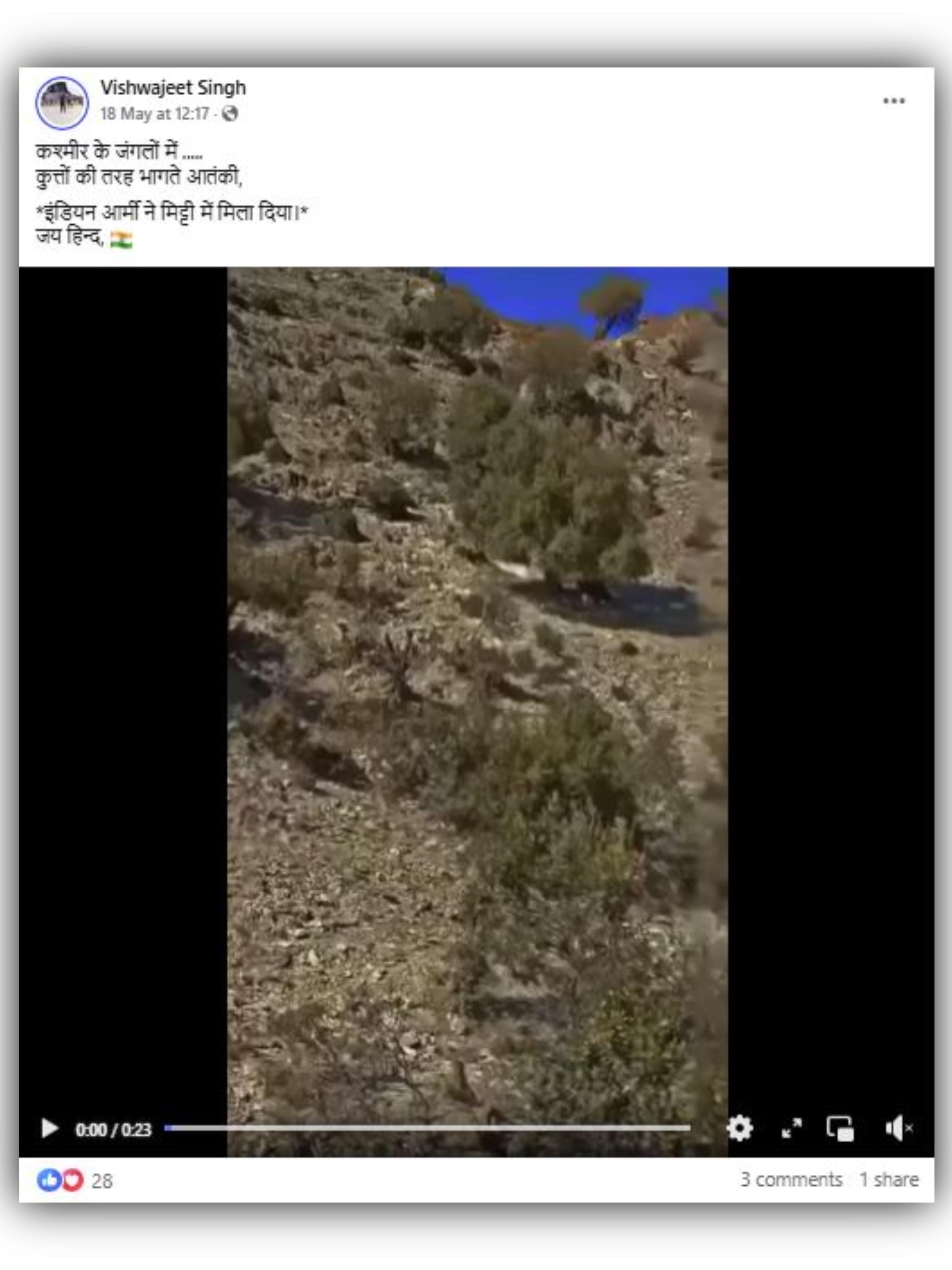 वीडियो को शेयर करते हुए एक फेसबुक यूजर ने लिखा, “कश्मीर के जंगलों में कुत्तों की तरह भागते आतंकी, इंडियन आर्मी ने मिट्टी में मिला दिया, जय हिन्द.”