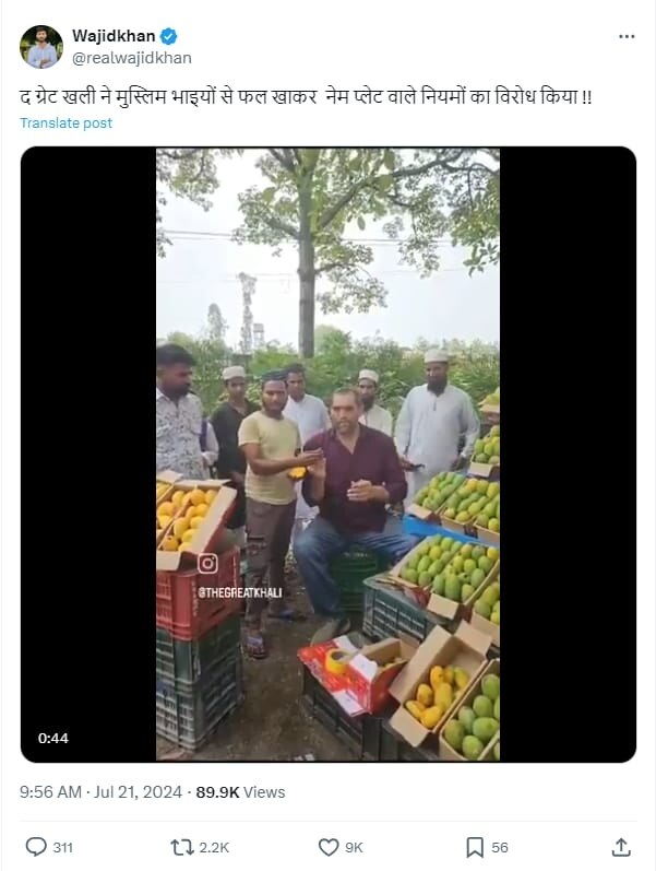 एक एक्स यूजर ने वायरल वीडियो को शेयर करते हुए लिखा, “द ग्रेट खली ने मुस्लिम भाइयों से फल खाकर नेम प्लेट वाले नियमों का विरोध किया !!” इस पोस्ट का आर्काइव्ड वर्जन यहां देखा जा सकता है.