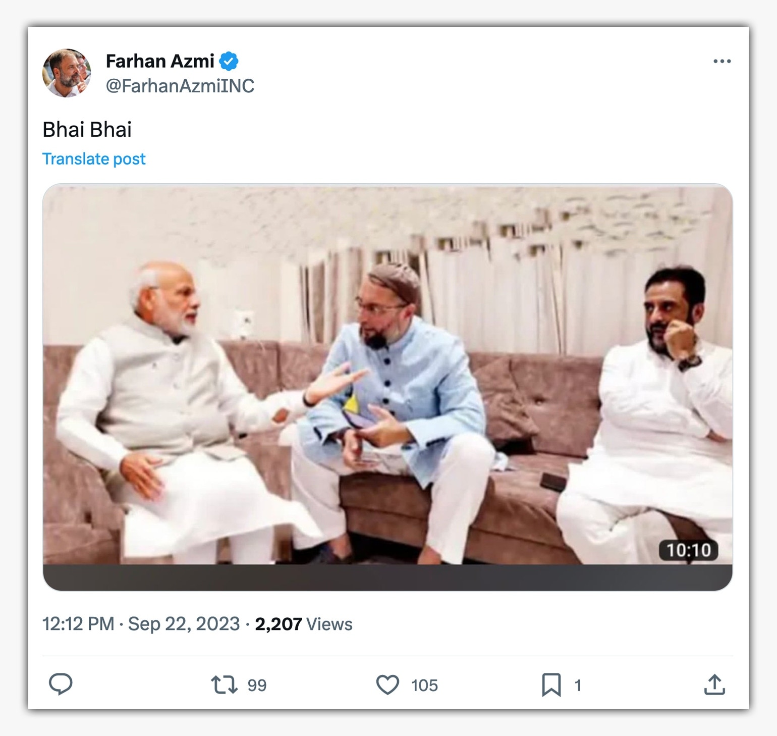 हैदराबाद से सांसद और ‘एआईएमआईएम’ पार्टी चीफ असदुद्दीन ओवैसी अक्सर प्रधानमंत्री मोदी की नीतियों के आलोचक रहे हैं. हाल ही में इंटरनेट पर एक फोटो तेजी से वायरल हो रही है जिसमें ओवैसी और प्रधानमंत्री मोदी को सोफा पर बैठे एक दूसरे से बातचीत करते हुए देखा जा सकता है. ओवैसी के साथ उनकी पार्टी के नेता इम्तियाज जलील भी बैठे नजर आ रहे हैं.
