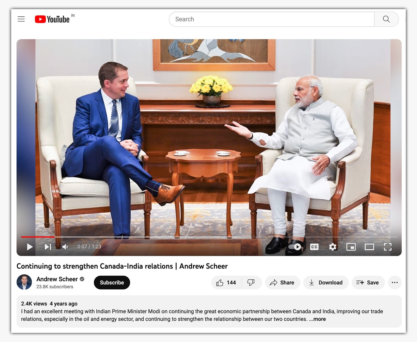 ओवैसी के साथ चिपकाई गई प्रधानमंत्री मोदी की इस तस्वीर को उनकी एक विदेशी राजनेता के साथ मुलाकात से लिया गया है. दरअसल, मोदी की ये तस्वीर साल 2018 की है, जब वे कनाडाई विपक्ष की कंजरवेटिव पार्टी के नेता एंड्रयू शीर से मुलाकात कर रहे थे.