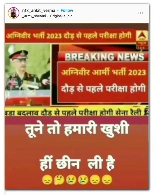 इस स्क्रीनशॉट पर एक तरफ ‘एबीपी न्यूज’ का लोगो भी लगा हुआ है और पूर्व सेनाध्यक्ष एमएम नरवणे की तस्वीर है. दूसरी ओर लिखा है, 'अग्निवीर भर्ती 2023 दौड़ से पहले परीक्षा होगी. Breaking News. बड़ा बदलाव दौड़ से पहले परीक्षा होगी सेना रैली.' इसके नीचे लिखा है, 'तूने तो हमारी खुशी ही छीन ली है.'