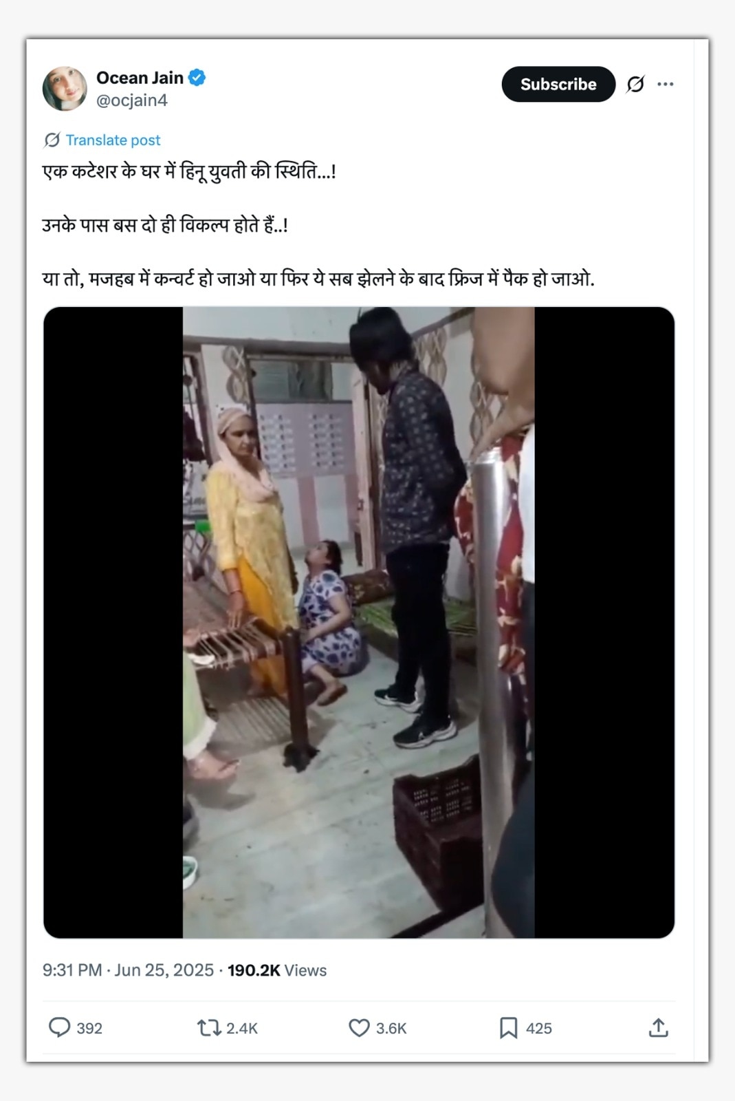 इसे शेयर करने वालों की मानें तो ये एक हिन्दू महिला है, जिसे एक मुस्लिम शख्स बुरी तरह पीट रहा है. वीडियो शेयर करते हुए एक व्यक्ति ने लिखा, “एक कटेशर के घर में हिनू युवती की स्थिति. उनके पास बस दो ही विकल्प होते हैं. या तो, मजहब में कन्वर्ट हो जाओ या फिर ये सब झेलने के बाद फ्रिज में पैक हो जाओ.”
