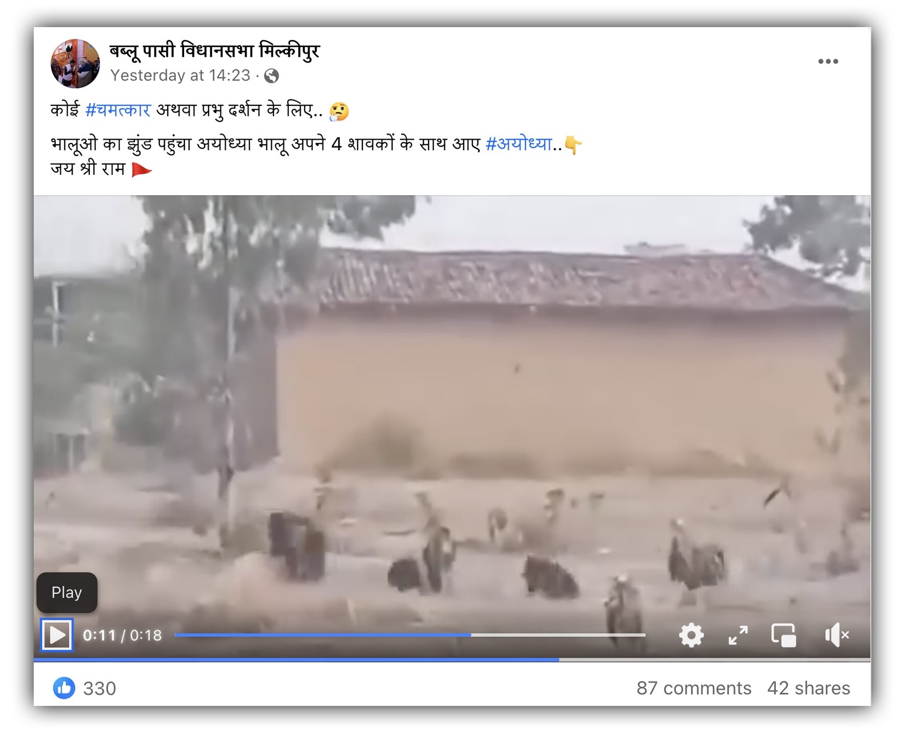 एक फेसबुक यूजर ने ये वीडियो पोस्ट करते हुए लिखा, “कोई चमत्कार अथवा प्रभु दर्शन के लिए. भालूओ का झुंड पहुंचा अयोध्या भालू अपने 4 शावकों के साथ आए अयोध्या. जय श्री राम.” इस वीडियो में राम भजन भी बज रहा है.”