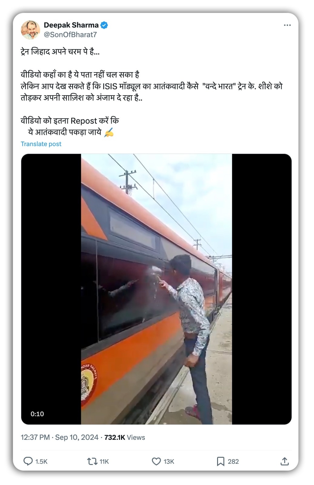 एक एक्स यूजर ने वायरल वीडियो शेयर कर लिखा, “ट्रेन जिहाद अपने चरम पे है… वीडियो कहाँ का है ये पता नहीं चल सका है लेकिन आप देख सकते हैं कि ISIS मॉड्यूल का आतंकवादी कैसे "वन्दे भारत" ट्रेन के. शीशे को तोड़कर अपनी साज़िश को अंजाम दे रहा है.. वीडियो को इतना Repost करें कि ये आतंकवादी पकड़ा जाये” इसी तरह के दावों के साथ वीडियो को फेसबुक और इंस्टाग्राम पर सैकड़ों लोग शेयर कर चुके हैं.