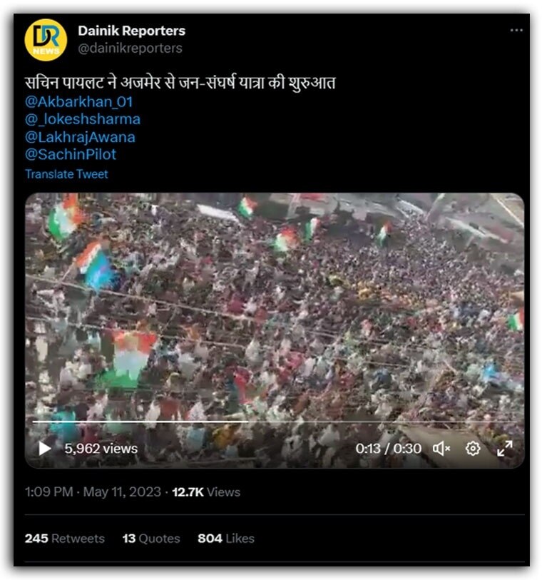 वीडियो ट्वीट करते हुए एक व्यक्ति ने लिखा, “हाथों में तिरंगा थामे भारत माता की जय के उदघोष के साथ जनसंघर्ष यात्रा का आगाज. भ्रष्टाचार के विरुद्ध, पायलट जनसंघर्षयात्रा में एकजुट राजस्थान.”