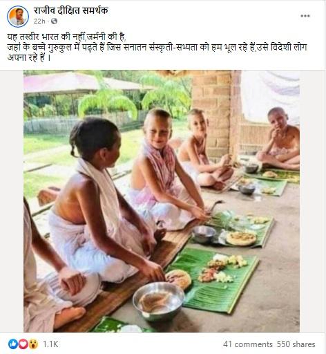 एक फेसबुक पेज ने इस तस्वीर को पोस्ट करते हुए लिखा है, "यह तस्वीर भारत की नहीं,जर्मनी की है, जहां के बच्चे गुरुकुल में पढ़ते हैं, जिस सनातन संस्कृती-सभ्यता को हम भूल रहे हैं, उसे विदेशी लोग अपना रहे हैं".