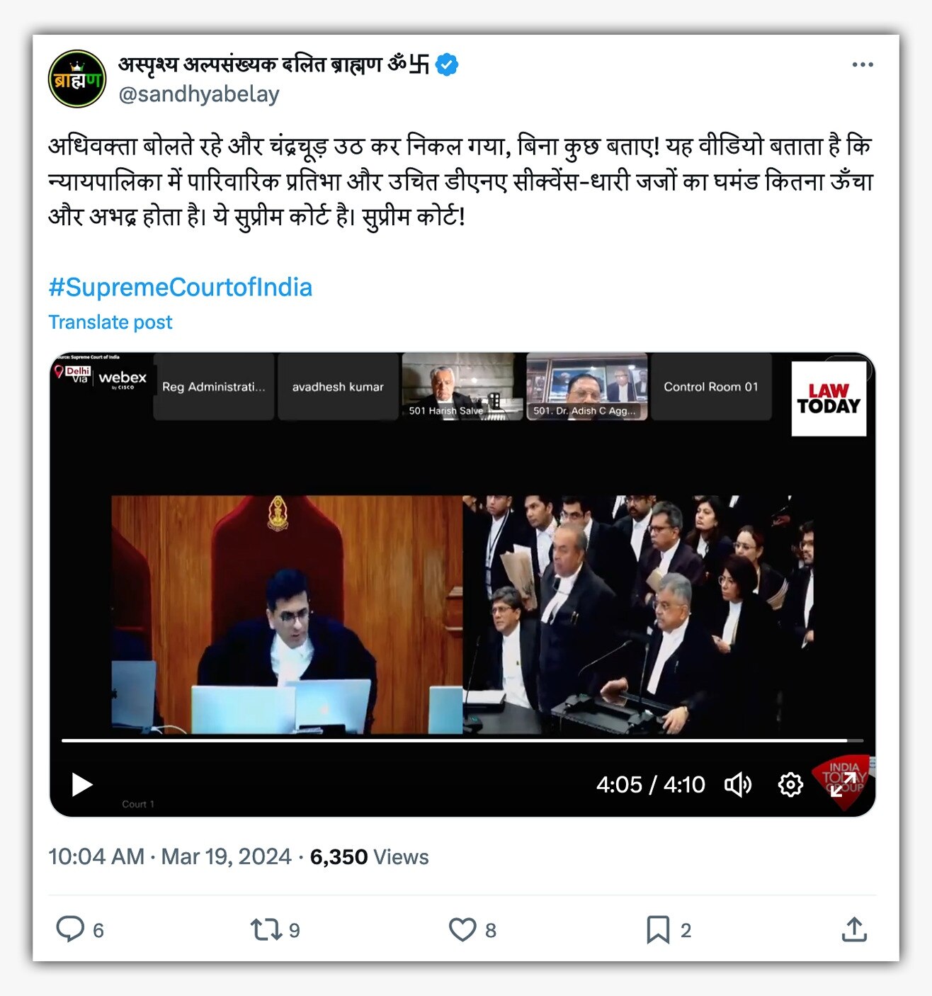 इसी वीडियो को शेयर करते हुए कुछ सोशल मीडिया यूजर्स सीजेआई चंद्रचूड़ पर निशाना साध रहे हैं. एक एक्स यूजर ने ये वीडियो शेयर करते हुए लिखा, “अधिवक्ता बोलते रहे और चंद्रचूड़ उठ कर निकल गया, बिना कुछ बताए! यह वीडियो बताता है कि न्यायपालिका में पारिवारिक प्रतिभा और उचित डीएनए सीक्वेंस-धारी जजों का घमंड कितना ऊँचा और अभद्र होता है. ये सुप्रीम कोर्ट है. सुप्रीम कोर्ट!” इस पोस्ट का आर्काइव्ड वर्जन यहां देखा जा सकता है.