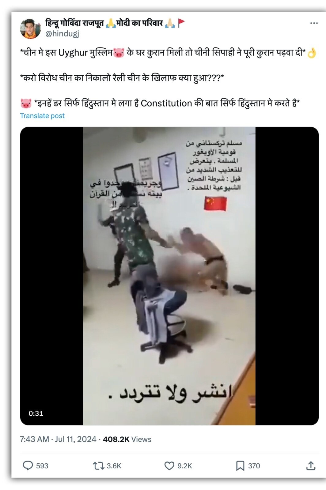 चीन में अल्पसंख्यक उइगर मुस्लिम समुदाय के लोगों पर कथित हिंसा और अत्याचार से जुड़ी खबरें अक्सर सामने आती रहती हैं. और अब सोशल मीडिया पर एक वीडियो वायरल हो गया है जिसके जरिये दावा किया जा रहा है कि चीन में एक सिपाही ने घर में कुरान रखने पर उइगर मुस्लिम समुदाय के एक शख्स की पिटाई कर दी. इसमें सैन्य वर्दी पहने हुए एक व्यक्ति को, जमीन पर बैठे एक शख्स को पीटते देखा जा सकता है.