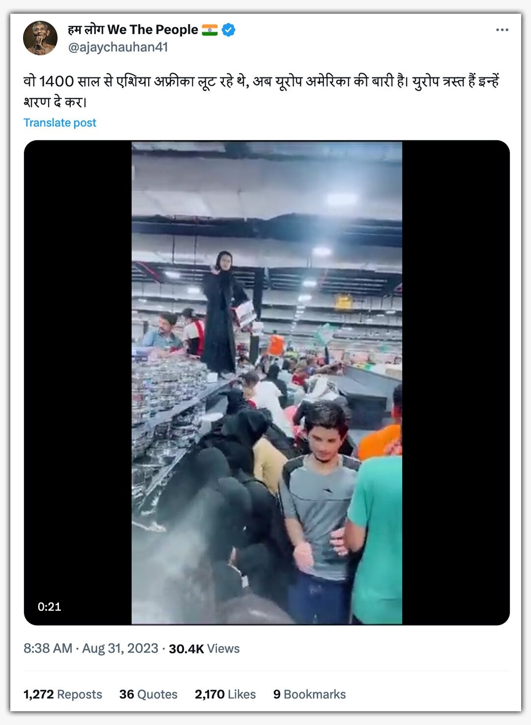 किसी शॉपिंग स्टोर में मची अफरातफरी का एक वीडियो सोशल मीडिया पर वायरल है. इसके जरिए कुछ लोग मुस्लिम समुदाय पर निशाना साध रहे हैं. वीडियो के साथ अप्रत्यक्ष रूप से कहा गया है कि एशिया व अफ्रीका को लूटने के बाद अब मुस्लिमों ने यूरोप लूटना शुरू कर दिया है.