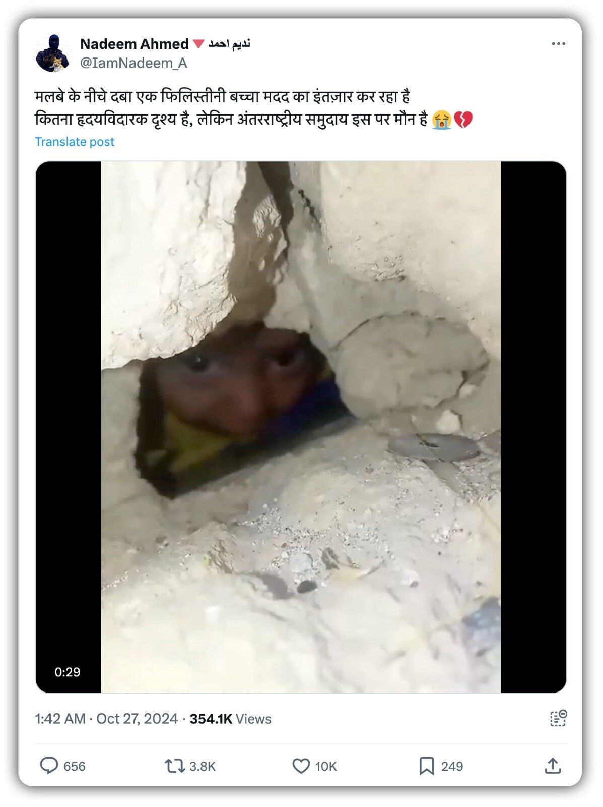 इसे एक्स पर शेयर करते हुए एक व्यक्ति ने लिखा, “मलबे के नीचे दबा एक फिलिस्तीनी बच्चा मदद का इंतजार कर रहा है, कितना हृदयविदारक दृश्य है, लेकिन अंतरराष्ट्रीय समुदाय इस पर मौन है”. ऐसे एक पोस्ट का आर्काइव्ड वर्जन यहां देखा जा सकता है.