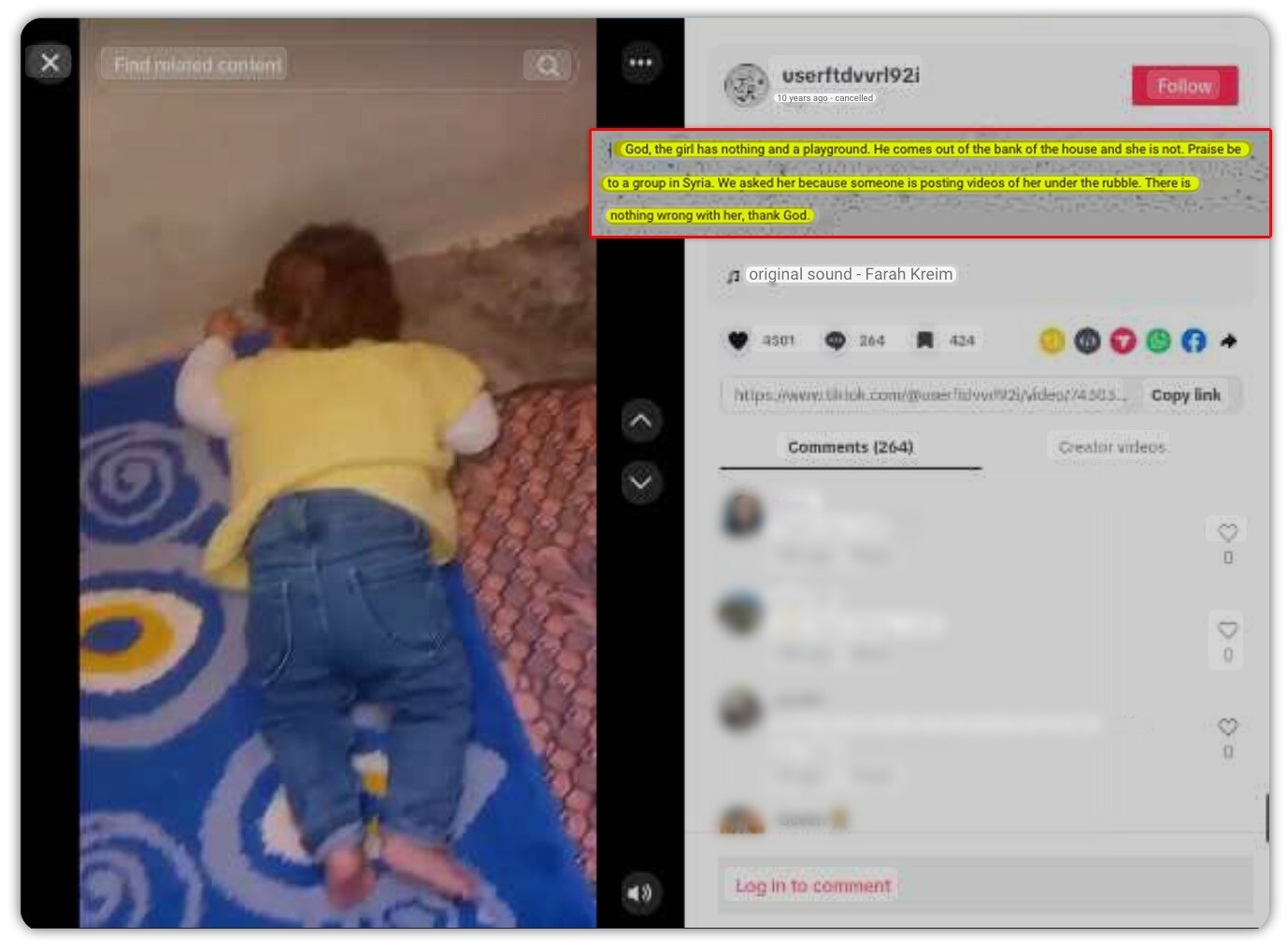 इस टिकटॉक अकाउंट पर पोस्ट किये गए एक वीडियो में बच्ची को फिलिस्तीनी बताने वाले दावों का भी जिक्र किया गया है. इसके कैप्शन में लिखा है कि ये बच्ची मलबे में नहीं फंसी थी, और वो एकदम सही-सलामत है. अरबी भाषा में लिखे कैप्शन में ये भी बताया गया है कि ये बच्ची फिलिस्तीन की नहीं बल्कि सीरिया की है. इस पोस्ट में लोगों से बच्ची के वीडियो अपलोड न करने की विनती भी की गई है.