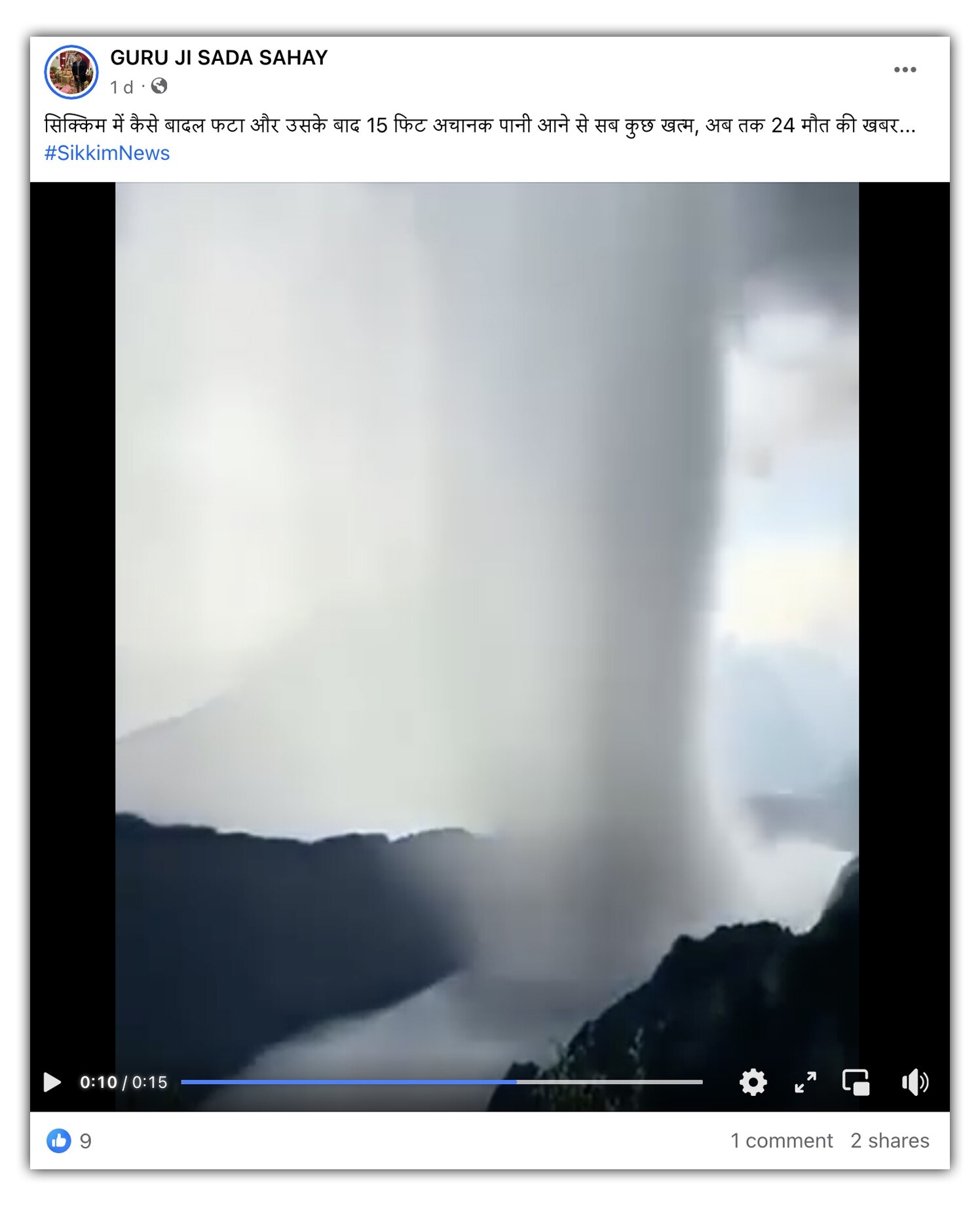 वीडियो को पोस्ट करते हुए एक फेसबुक यूजर ने लिखा, "सिक्किम में कैसे बादल फटा और उसके बाद 15 फिट अचानक पानी आने से सब कुछ खत्म, अब तक 24 मौत की खबर".