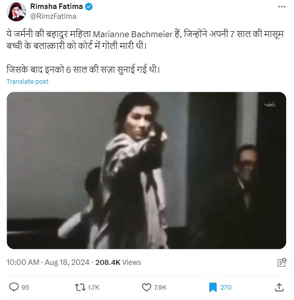 वीडियो के साथ कहा जा रहा है कि मैरीएन बाकमायर नाम की जर्मनी की इस महिला ने अपनी सात साल की बच्ची का रेप करने वाले को कोर्ट में गोली मार दी थी. बाद में महिला को छह साल की सजा सुनाई गई थी.