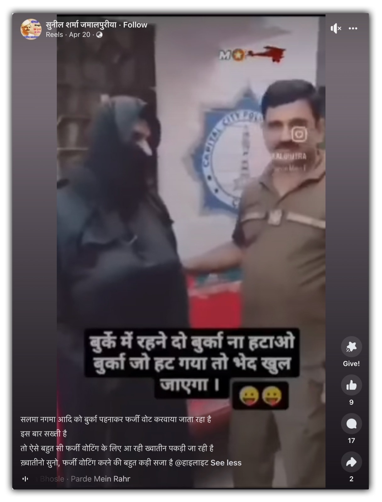 “बुर्के में रहने दो बुर्का ना हटाओ, बुर्का जो हट गया तो भेद खुल जाएगा”- चुनावी हलचल के बीच इस कैप्शन के साथ एक वीडियो सोशल मीडिया पर काफी वायरल हो रहा है. वीडियो के जरिए ये कहने की कोशिश की जा रही है कि लोकसभा चुनावों में बुर्का पहनकर फर्जी वोटिंग कर रहा एक मुस्लिम आदमी पकड़ा गया.