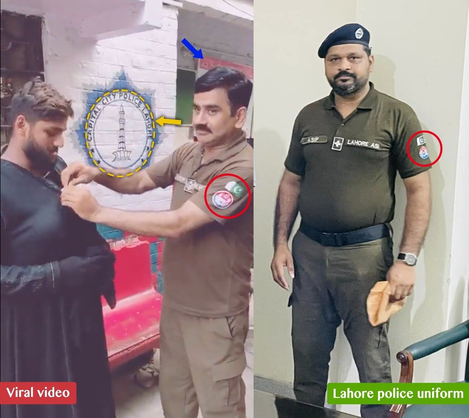 वीडियो में जो सिपाही दिख रहा है उसकी बाजू पर पाकिस्तान का झंडा भी नजर आता है. सिपाही की वर्दी भी लाहौर पुलिस की वर्दी से मिल रही है. पीछे दीवार पर एक बोर्ड लगा है जिसमें उर्दू लिखी दिख रही है.