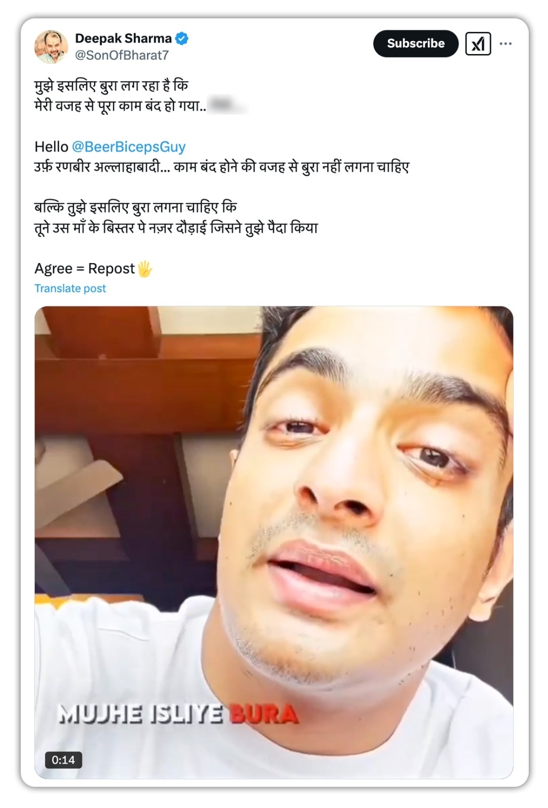 वीडियो शेयर करने वाले यूजर्स का दावा है कि ये इलाहाबादिया का अभी का वीडियो है जो उन्होंने विवाद होने के बाद बनाया है. वीडियो को शेयर करते हुए लोग कैप्शन में लिख रहे हैं, “मुझे इसलिए बुरा लग रहा है कि मेरी वजह से पूरा काम बंद हो गया.. Hello @BeerBicepsGuy उर्फ़ रणवीर अल्लाहाबादी... काम बंद होने की वजह से बुरा नहीं लगना चाहिए बल्कि तुझे इसलिए बुरा लगना चाहिए कि तूने उस माँ के बिस्तर पे नज़र दौड़ाई जिसने तुझे पैदा किया”. फेसबुक पर भी वीडियो को इसी दावे के साथ शेयर किया जा रहा है.
