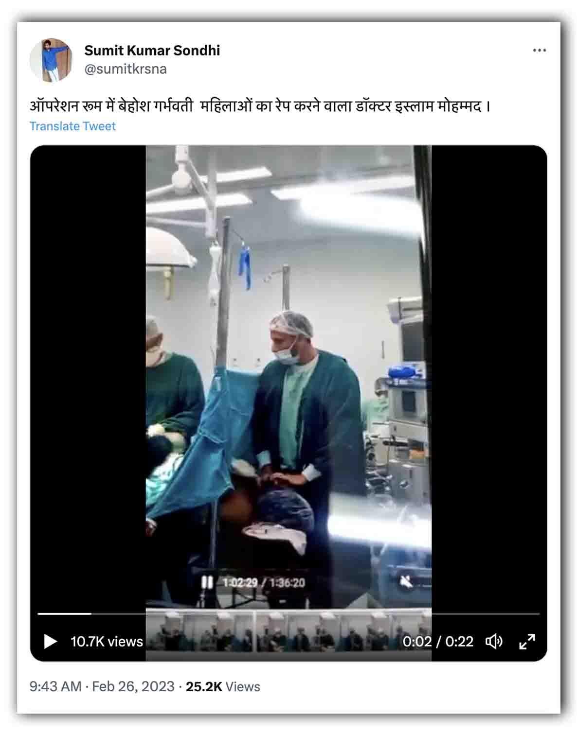 एक ट्विटर यूजर ने इसे शेयर करते हुए लिखा, "ऑपरेशन रूम में बेहोश गर्भवती महिलाओं का रेप करने वाला डॉक्टर इस्लाम मोहम्मद, सभी सनातनी हिन्दू भाइयों से अपील है की इस वीडियो को अधिक से शेयर करें, जिससे इस डॉक्टर को कड़ी से कड़ी सजा मिले जिससे कोई दूसरा डॉक्टर इस्लाम मोहम्मद बनने की हिमाकत न करे."