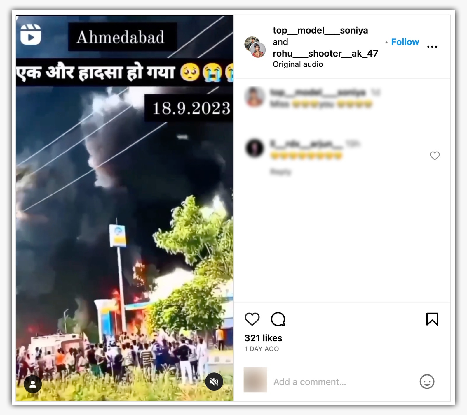 किसी पेट्रोल पंप के पास लगी आग का एक वीडियो इंस्टाग्राम पर वायरल हो रहा है. वीडियो के साथ कहा गया है कि ये घटना गुजरात के अहमदाबाद में 18 सितंबर, 2023 को हुई थी. कुछ यूजर्स ने ये तो नहीं लिखा कि वीडियो अहमदाबाद का है, लेकिन उनका दावा है कि हाल ही में हुए इस हादसे में पता नहीं कितने लोगों की जान चली गई है.