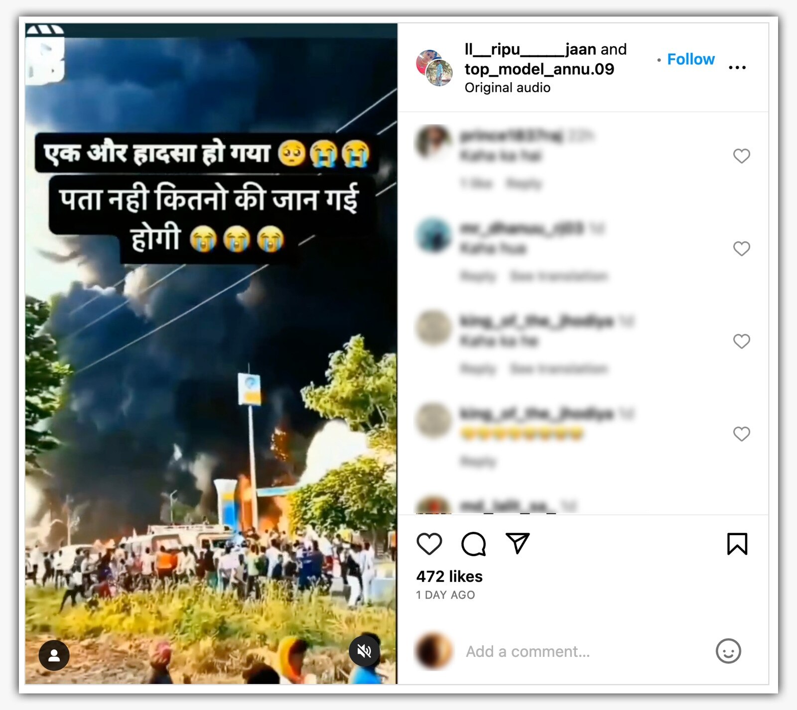 वीडियो में एक पेट्रोल पंप के नजदीक से आग की भयानक लपटें और धुंआ उठते देखा जा सकता है. पंप के आसपास लोगों की अफरा-तफरी मची हुई है. बैकग्राउंड में चीख-पुकार की आवाज आ रही है. इंस्टाग्राम पर कई और भी यूजर्स इस वीडियो को शेयर कर चुके हैं. वायरल पोस्ट का आर्काइव्ड वर्जन यहां देखा जा सकता है.