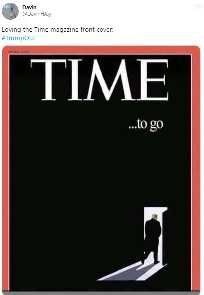 ये तस्वीर ज्यादातर वॉट्सएप पर वायरल हो रही है. ट्विटर पर भी कई यूजर्स ने ये तस्वीर पोस्ट की है और लिखा है, “लविंग टाइम मैगजीन फ्रंट कवर: ट्रम्प आउट”.