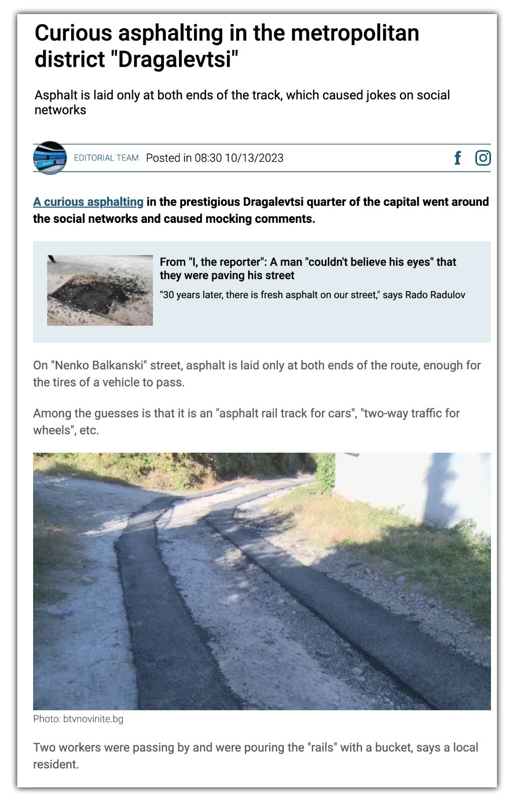 बुल्गारिया के मीडिया आउटलेट bTV न्यूज ने इस सड़क की एक अन्य तस्वीर शेयर करते हुए, किसी स्थानीय शख्स के हवाले से जानकारी दी थी कि इसे बनाने आए दो मजदूरों ने बाल्टी में डामर भर के सीधी पट्टियां बनाईं और चलते बने. ये डामर भी इतनी खराब क्वॉलिटी का था कि हाथ से ही उखड़ रहा था.