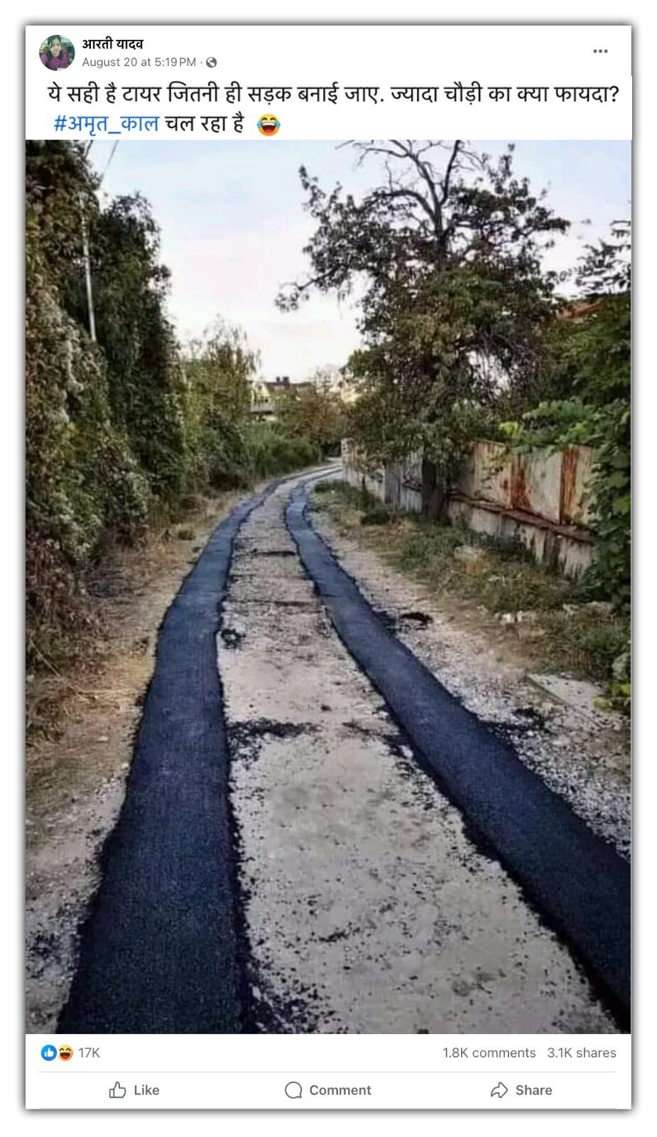 फेसबुक पर इसे शेयर करते हुए एक व्यक्ति ने लिखा, “ये सही है टायर जितनी ही सड़क बनाई जाए. ज्यादा चौड़ी का क्या फायदा? अमृत काल चल रहा है."