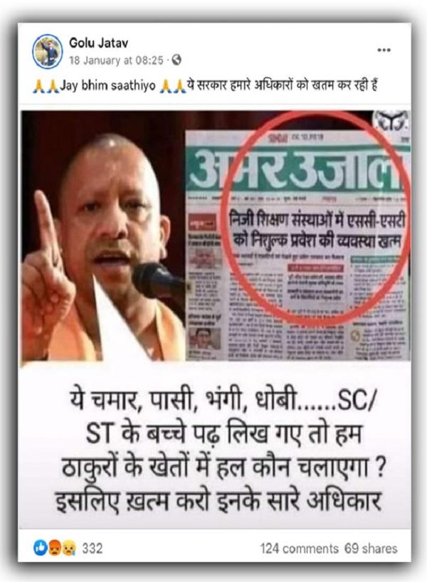 अनुसूचित जाति व जनजाति (एससी-एसटी) के छात्रों को लेकर सोशल मीडिया पर एक पोस्ट तेजी से वायरल हो रही है. पोस्ट में "अमर उजाला" अखबार की एक कटिंग और योगी आदित्यनाथ की तस्वीर के जरिये ऐसा बताने की कोशिश की गई है कि उत्तर प्रदेश के निजी शिक्षण संस्थानों में एससी-एसटी छात्रों के लिए निशुल्क प्रवेश की व्यवस्था खत्म कर दी गई है. सोशल मीडिया यूजर्स इस पोस्ट के कैप्शन में कह रहे हैं कि सरकार दलित समुदाय के लोगों के अधिकार खत्म कर रही है.