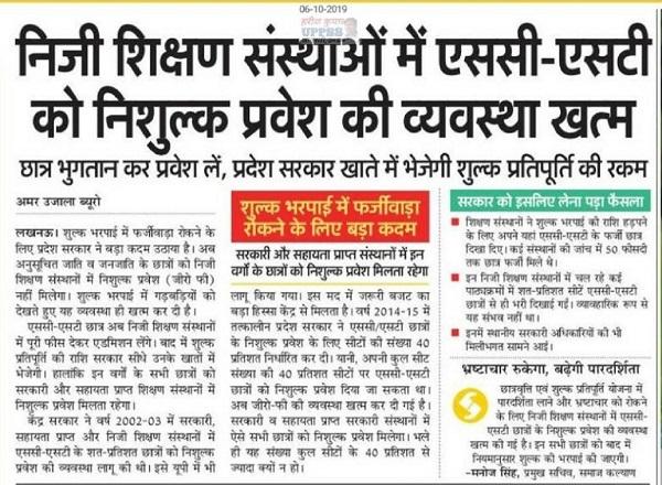 खबर के मुताबिक, निजी शिक्षण संस्थान सरकार से प्रवेश शुल्क भरपाई की रकम हड़पने के लिए एससी-एसटी छात्रों के फर्जी एडमिशन दिखा देते थे. शिक्षण संस्थानों में 50 प्रतिशत तक छात्र फर्जी पाए गए थे. ऐसे कई मामले सामने आ चुके थे. इसी के चलते "जीरो फीस" की इस व्यवस्था को बदलकर यूपी सरकार ने शुल्क प्रतिपूर्ति व्यवस्था लागू कर दी थी.