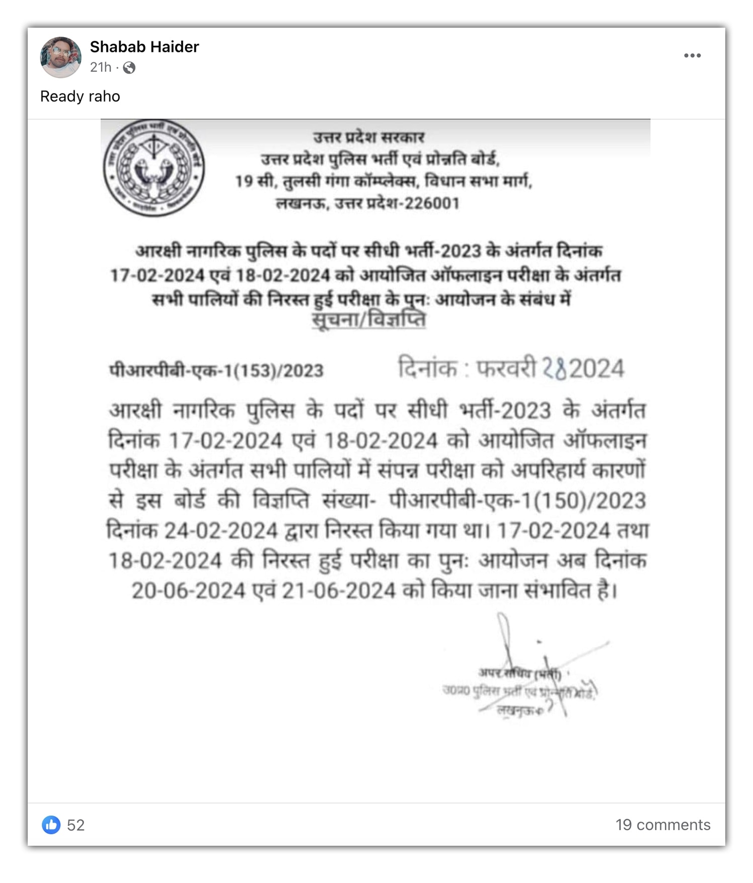 पेपर लीक के आरोपों के बाद कैंसिल हुई यूपी पुलिस कॉन्स्टेबल की परीक्षा क्या अब 20 और 21 जून को होगी? सोशल मीडिया पर वायरल एक कथित नोटिस को शेयर करते हुए कुछ लोग यही कह रहे हैं.
