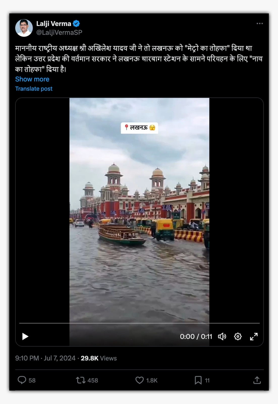 इसे एक्स पर शेयर करते हुए समाजवादी पार्टी के अंबेडकरनगर सांसद लालजी वर्मा ने लिखा, “माननीय राष्ट्रीय अध्यक्ष श्री अखिलेश यादव जी ने तो लखनऊ को "मेट्रो का तोहफा" दिया था, लेकिन उत्तर प्रदेश की वर्तमान सरकार ने लखनऊ चारबाग स्टेशन के सामने परिवहन के लिए "नाव का तोहफा" दिया है.” इस पोस्ट का आर्काइव्ड वर्जन यहां देखा जा सकता है.