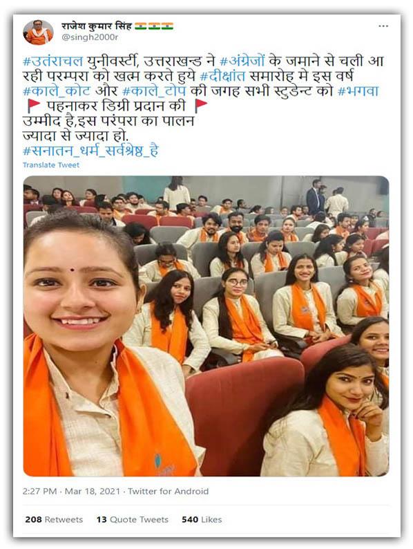 एक फेसबुक यूजर ने ये फोटो शेयर करते हुए कैप्शन लिखा, “उतंराचल यूनिवर्सिटी, उत्तराखन्ड ने अंग्रेजों के जमाने से चली आ रही परम्परा को खत्म करते हुये दीक्षांत समारोह मे इस वर्ष काले कोट और काले टोप की जगह सभी स्टूडेन्ट को भगवा पहनाकर डिग्री प्रदान की. उम्मीद है, इस परंपरा का पालन ज्यादा से ज्यादा हो. सनातन धर्म सर्वश्रेष्ठ है.”