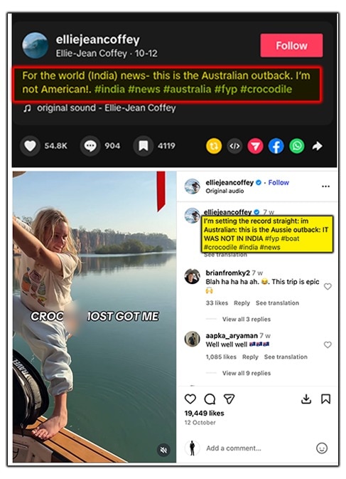 वीडियो के साथ कैप्शन में क्रियेटर ने बताया है कि वो अमेरिकी नहीं बल्कि एक ऑस्ट्रेलियाई नागरिक हैं. उन्होंने बताया कि ये वीडियो ऑस्ट्रेलिया के आउट्बैक का है और वो भारत नहीं आईं थीं. इससे पहले उन्होंने ये वीडियो 29 अगस्त को इंस्टाग्राम पर पोस्ट किया था.