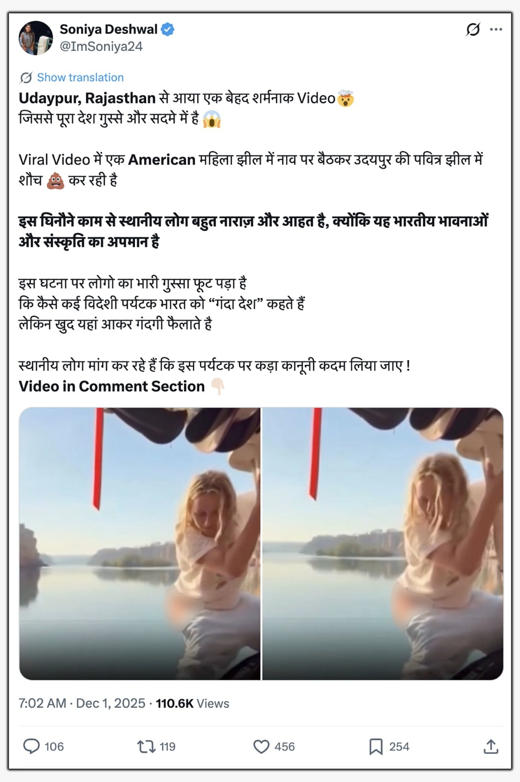 मिसाल के तौर पर एक्स पर एक व्यक्ति ने लिखा, “इस घिनौने काम से स्थानीय लोग बहुत नाराज़ और आहत है, क्योंकि यह भारतीय भावनाओं और संस्कृति का अपमान है. इस घटना पर लोगो का भारी गुस्सा फूट पड़ा है कि कैसे कई विदेशी पर्यटक भारत को “गंदा देश” कहते हैं. लेकिन खुद यहां आकर गंदगी फैलाते है.” इस पोस्ट का आर्काइव वर्जन यहां देखा जा सकता है.