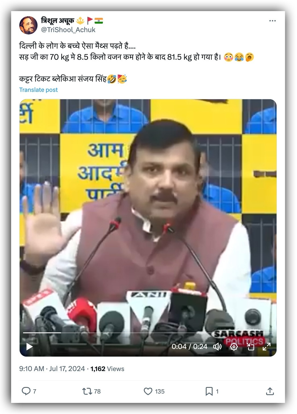 एक एक्स यूजर ने वायरल वीडियो को शेयर करते हुए लिखा, “दिल्ली के लोग के बच्चे ऐसा मैथ्स पढ़ते है.... सड़ जी का 70 kg मे 8.5 किलो वजन कम होने के बाद 81.5 kg हो गया है। कट्टर टिकट ब्लेकिआ संजय सिंह.” इस पोस्ट का आर्काइव्ड वर्जन यहां देखा जा सकता है.