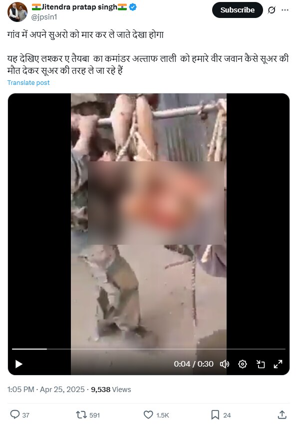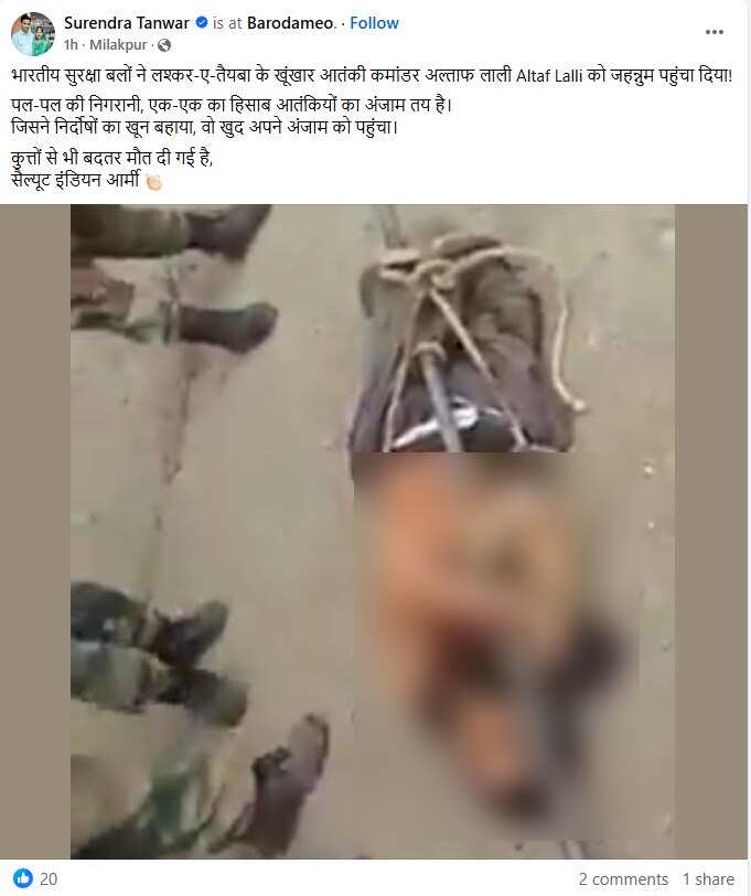 अब अल्ताफ लाली के एनकाउंटर से जोड़कर सोशल मीडिया पर एक वीडियो वायरल हो रहा है जिसमें सेना के जवान एक डेड बॉडी को डंडे से लटकाकर कहीं से लाते दिख रहे हैं. आसपास सेना की वर्दी में कई और लोग भी दिख रहे हैं. आपस में ये लोग हिंदी में बात कर रहे हैं. वीडियो के साथ कहा जा रहा ये लाश अल्ताफ लाली की है जिसे सेना ने मार गिराया.