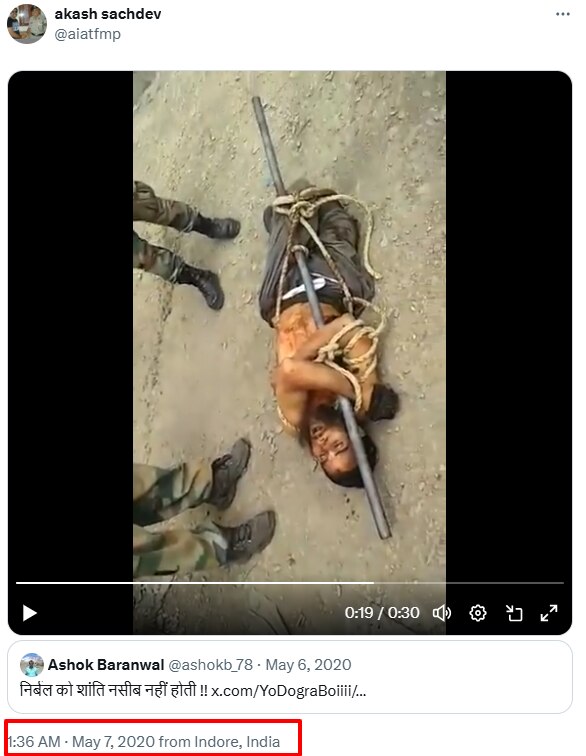 वीडियो के कीफ्रेम्स को रिवर्स सर्च करने पर ये हमें 7 मई, 2020 के एक एक्स पोस्ट में मिला. यहां वीडियो के साथ कोई और जानकारी नहीं दी गई है.