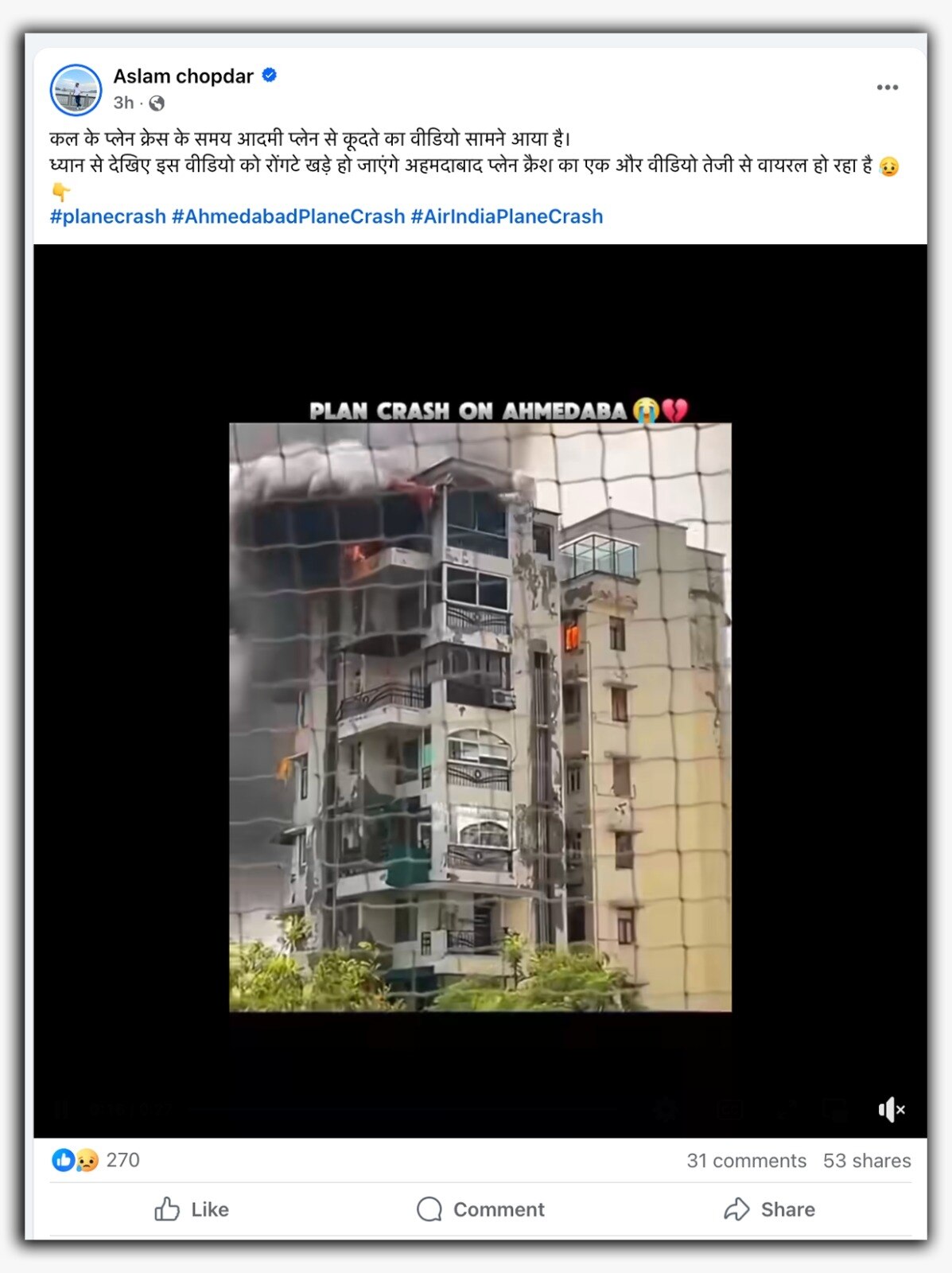 इस वीडियो को फेसबुक पर शेयर करते हुए एक व्यक्ति ने लिखा, “कल के प्लेन क्रेस के समय आदमी प्लेन से कूदते का वीडियो सामने आया है. ध्यान से देखिए इस वीडियो को रोंगटे खड़े हो जाएंगे अहमदाबाद प्लेन क्रैश का एक और वीडियो तेजी से वायरल हो रहा है.” इस पोस्ट का आर्काइव्ड वर्जन यहां देखा जा सकता है.