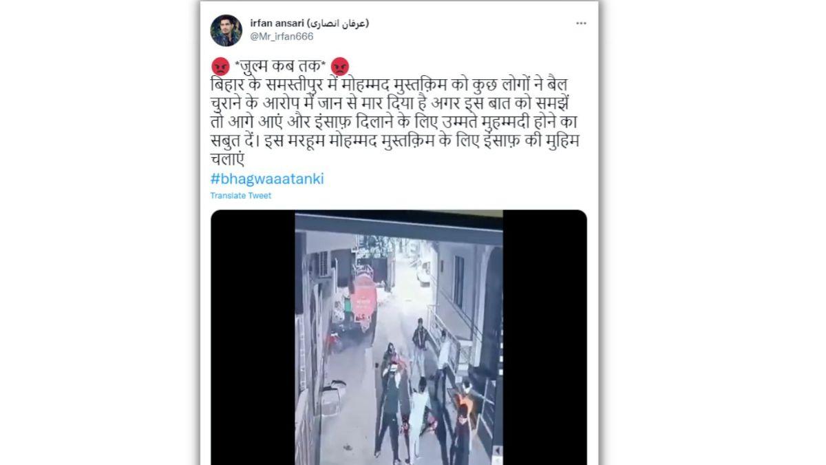 एक ट्विटर यूजर ने इस वीडियो को शेयर करते हुए लिखा, “बिहार: समस्तीपुर में बैल चोरी के आरोप में भीड़ द्वारा मोहम्मद मुस्तक़ीम नामी युवक की बेरहमी से पीट पीटकर हत्या कर दी गई… पुलिस ने तीन नामज़द समेत अन्य अज्ञातों के ख़िलाफ़ मामला दर्ज किया है…”