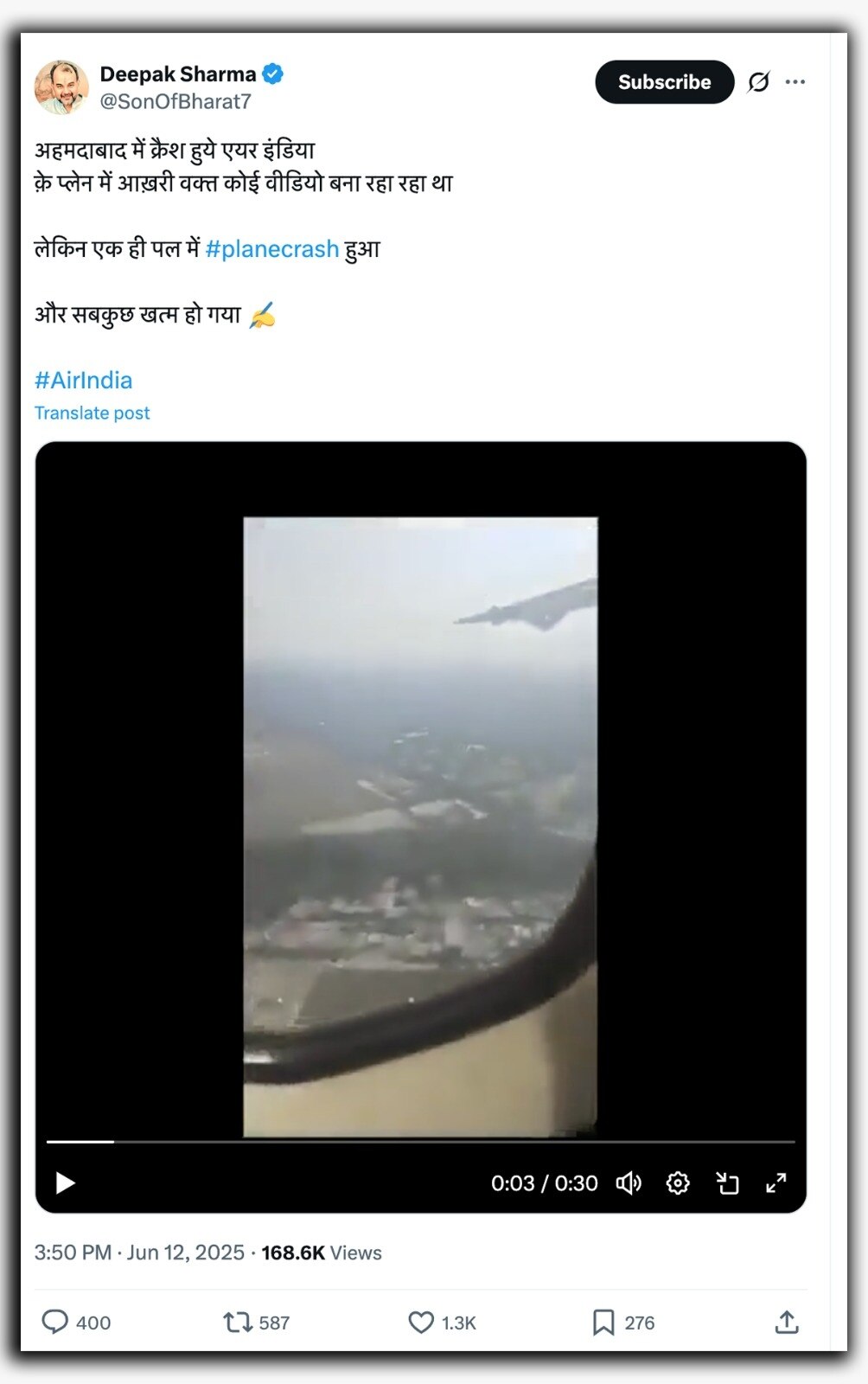 वीडियो को ‘एक्स’ पर शेयर करते हुए एक व्यक्ति ने लिखा, “अहमदाबाद में क्रैश हुये एयर इंडिया क़े प्लेन में आख़री वक्त कोई वीडियो बना रहा रहा था लेकिन एक ही पल में #planecrash हुआ और सबकुछ खत्म हो गया.#AirIndia” इस पोस्ट का आर्काइव्ड वर्जन यहां देखा जा सकता है.