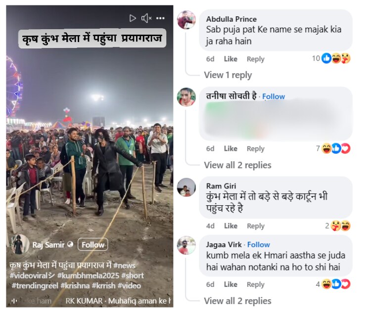 लोगों का कहना है कि ये वीडियो प्रयागराज में चल रहे महाकुंभ का है. पोस्ट के जवाब में कई लोग नाराजगी जता रहे हैं कि महाकुंभ पहुंचकर किस तरह ये शख्स लोगों की आस्था और धार्मिक भावनाओं को ठेस पहुंचा रहा है.