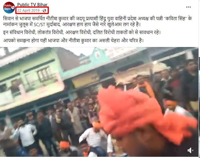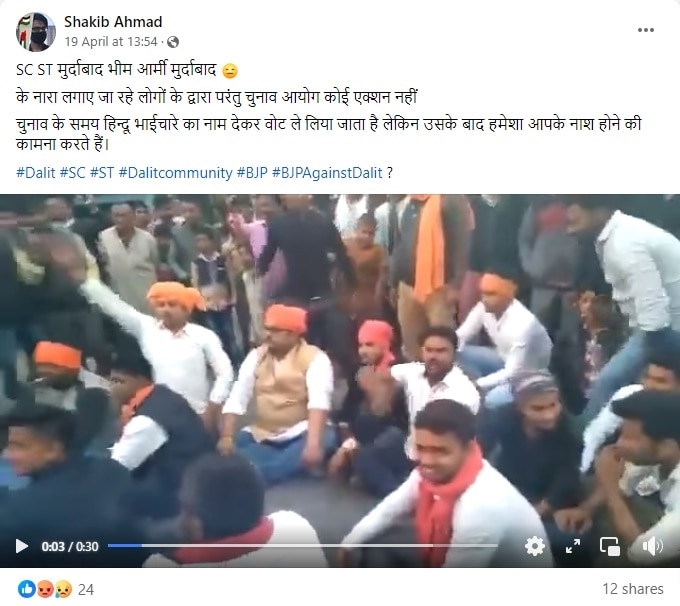 वीडियो को हाल-फिलहाल का बताकर दावा किया जा रहा है कि दलित विरोधी नारे लगा रहे यह लोग बीजेपी के हैं. साथ ही कहा गया है कि खुलेआम इस तरह के नारे लगाने के बावजूद चुनाव आयोग इन पर कोई एक्शन नहीं ले रहा.