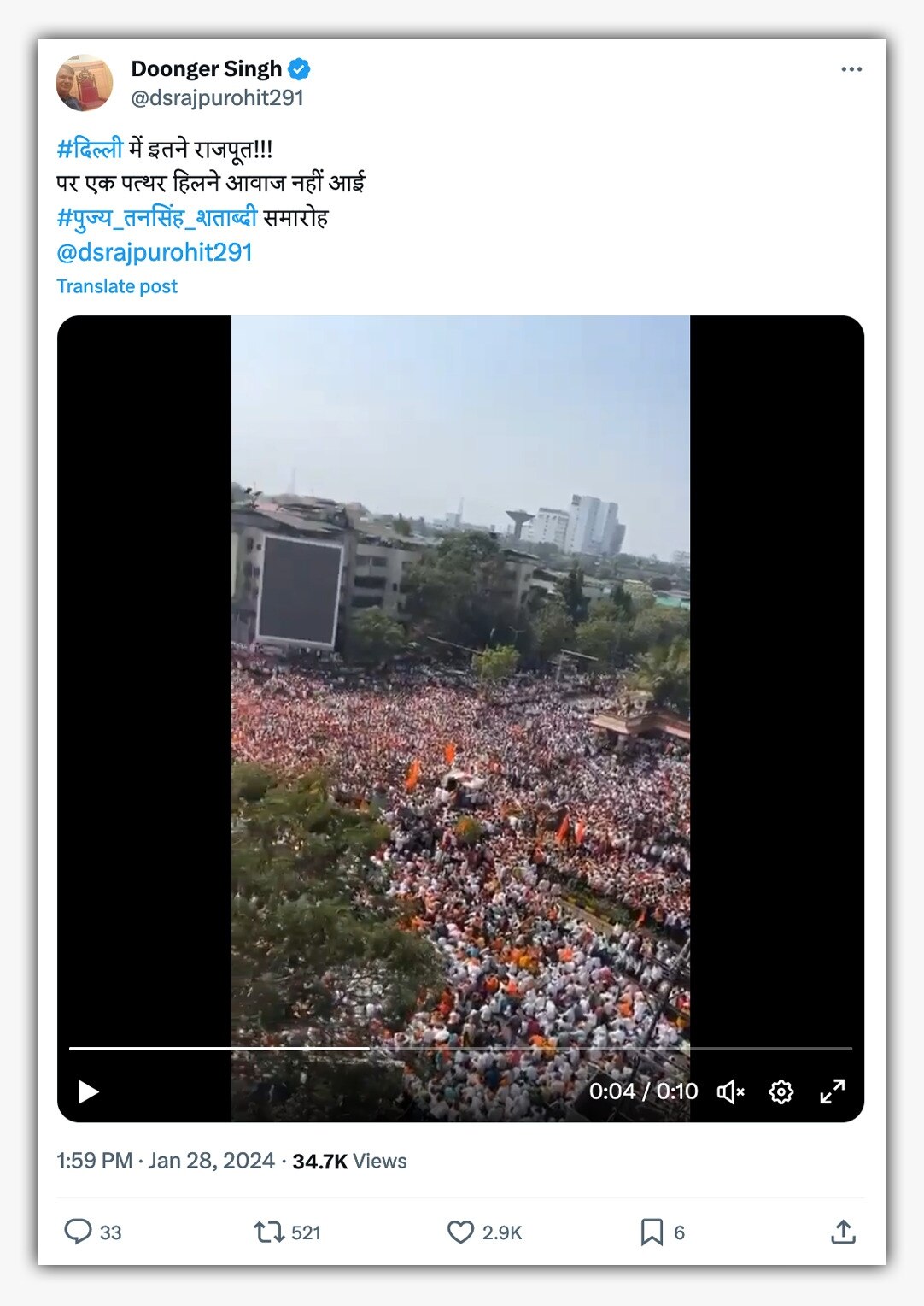 फेसबुक पर ये वीडियो शेयर करते हुए एक व्यक्ति ने लिखा, "ए दिल्ली दिल खोल कर स्वागत कर, तुझे महफूज रखने वाले क्षत्रियो के वंशज आये है, आज दिल्ली में श्री क्षत्रिय युवक संघ संस्थापक परम पूज्य बावजी तन सिंह जी की जन्म शताब्दी के अवसर पर क्षत्रिय महाकुंभ."