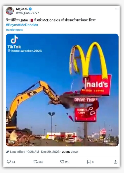 अब सोशल मीडिया पर एक वीडियो तेजी से वायरल हो रहा है, जिसमें एक क्रेन को मैकडॉनल्ड्स के बोर्ड को तोड़ते हुए देखा जा सकता है. लोग अब इस वीडियो को शेयर कर इसे अरब देश कतर का बता रहे हैं.