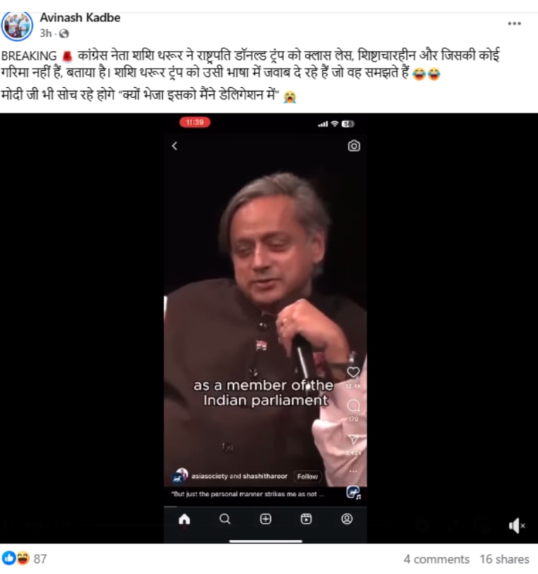 वीडियो फेसबुक पर शेयर करते हुए एक व्यक्ति ने लिखा, “BREAKING. कांग्रेस नेता शशि थरूर ने राष्ट्रपति डॉनल्ड ट्रंप को क्लास लेस, शिष्टाचारहीन और जिसकी कोई गरिमा नहीं हैं, बताया है. शशि थरूर ट्रंप को उसी भाषा में जवाब दे रहे हैं जो वह समझते हैं. मोदी जी भी सोच रहे होगे ‘क्यों भेजा इसको मैंने डेलिगेशन में’."